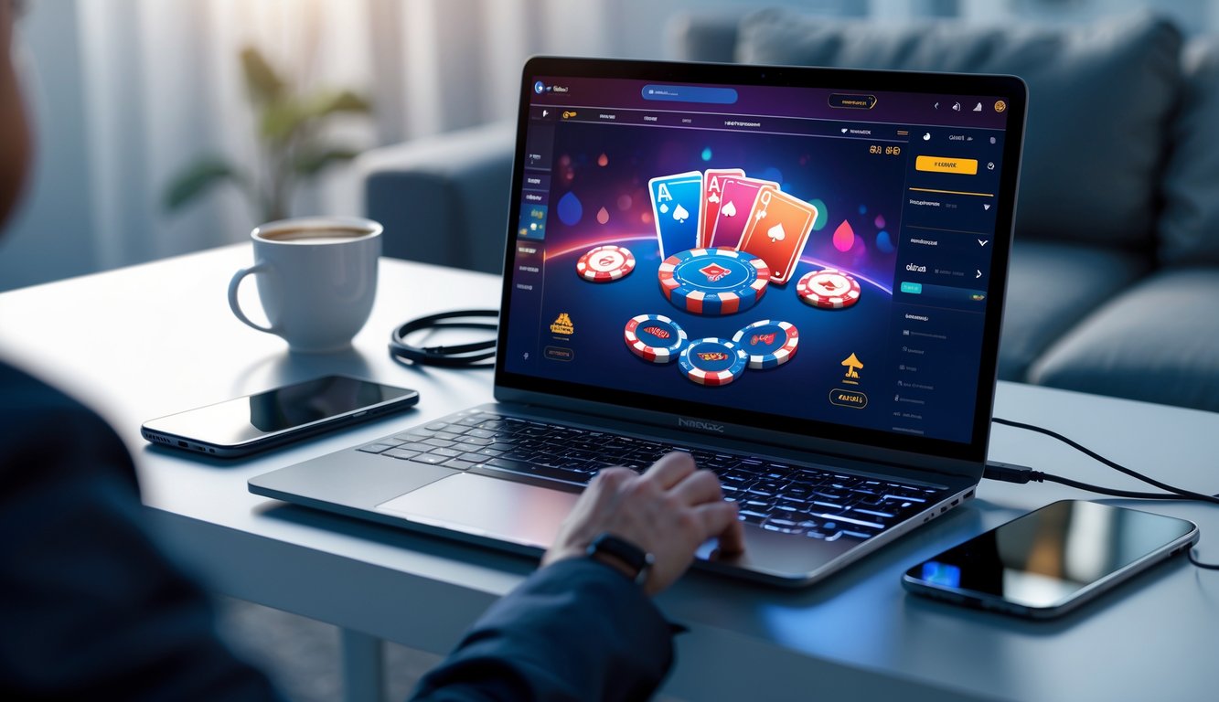 Seorang pemain poker online menggunakan komputer dengan tampilan permainan poker digital yang cerah di meja kerja yang rapi.